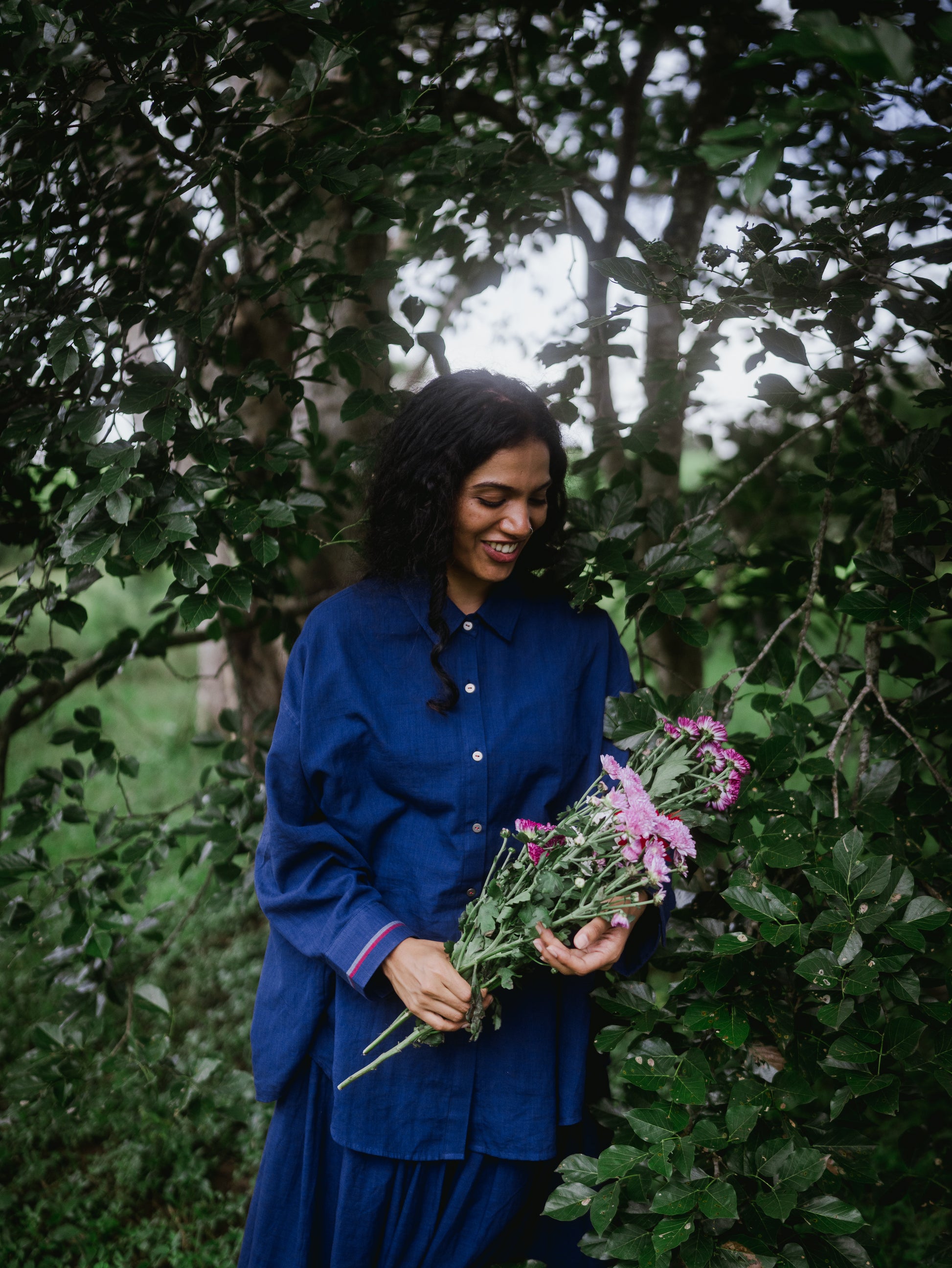 Oversized button-down shirt crafted in handwoven cotton with minimal selvedge detailing at the sleeves and back yoke. Along with a beautifully crafted gathered skirt.