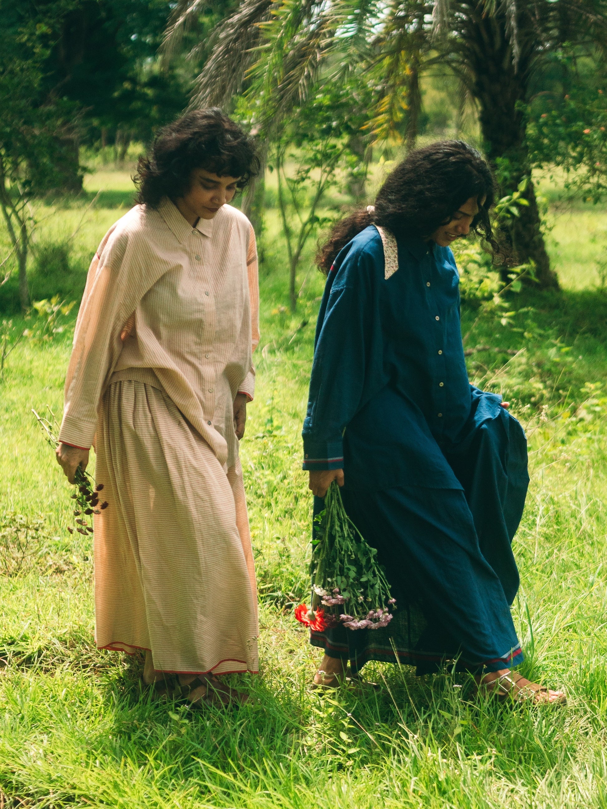 A fully gathered skirt crafted in a handwoven cotton with minimal selvedge detailing.